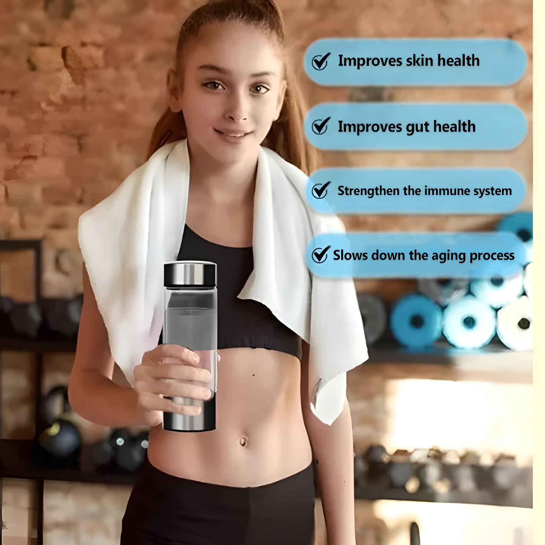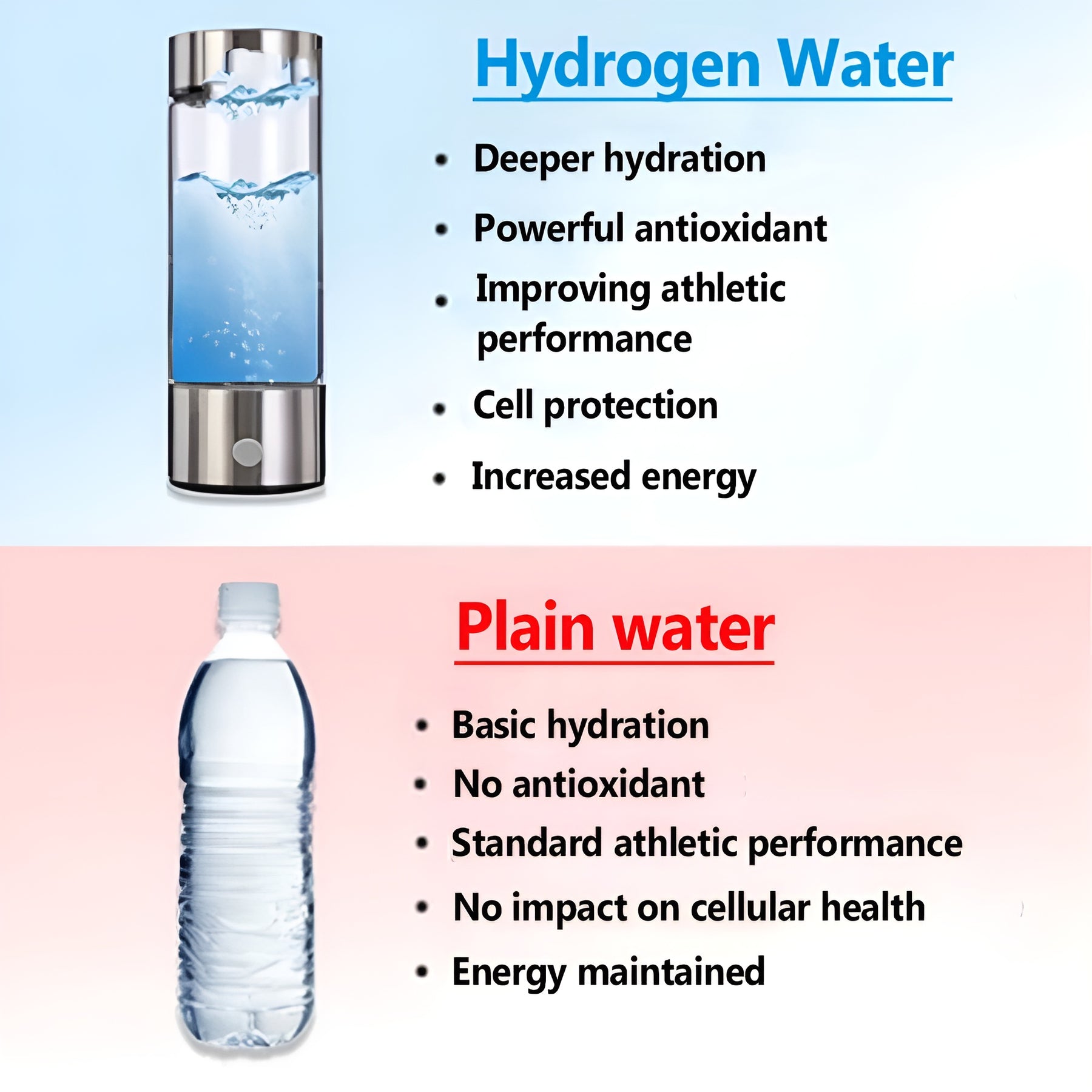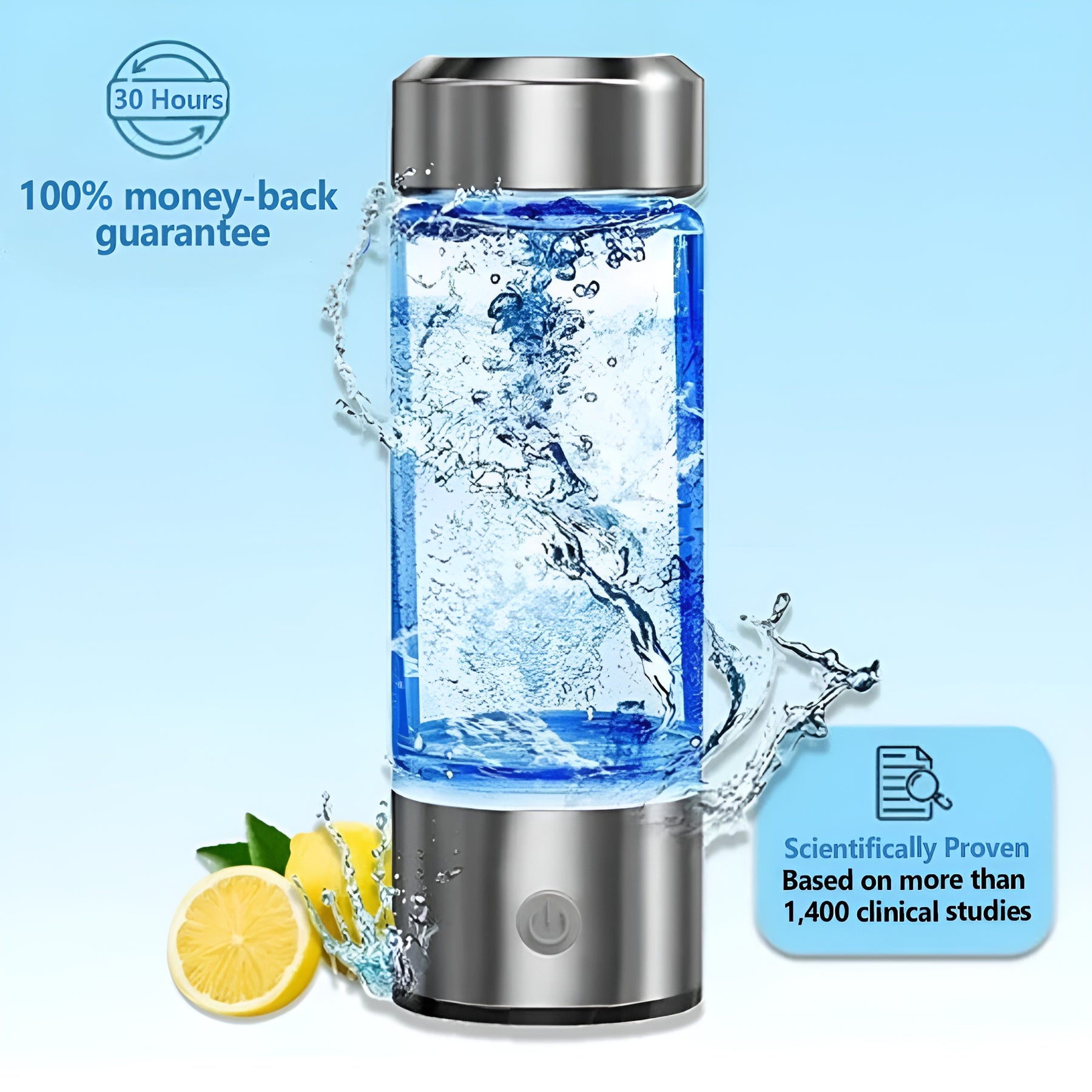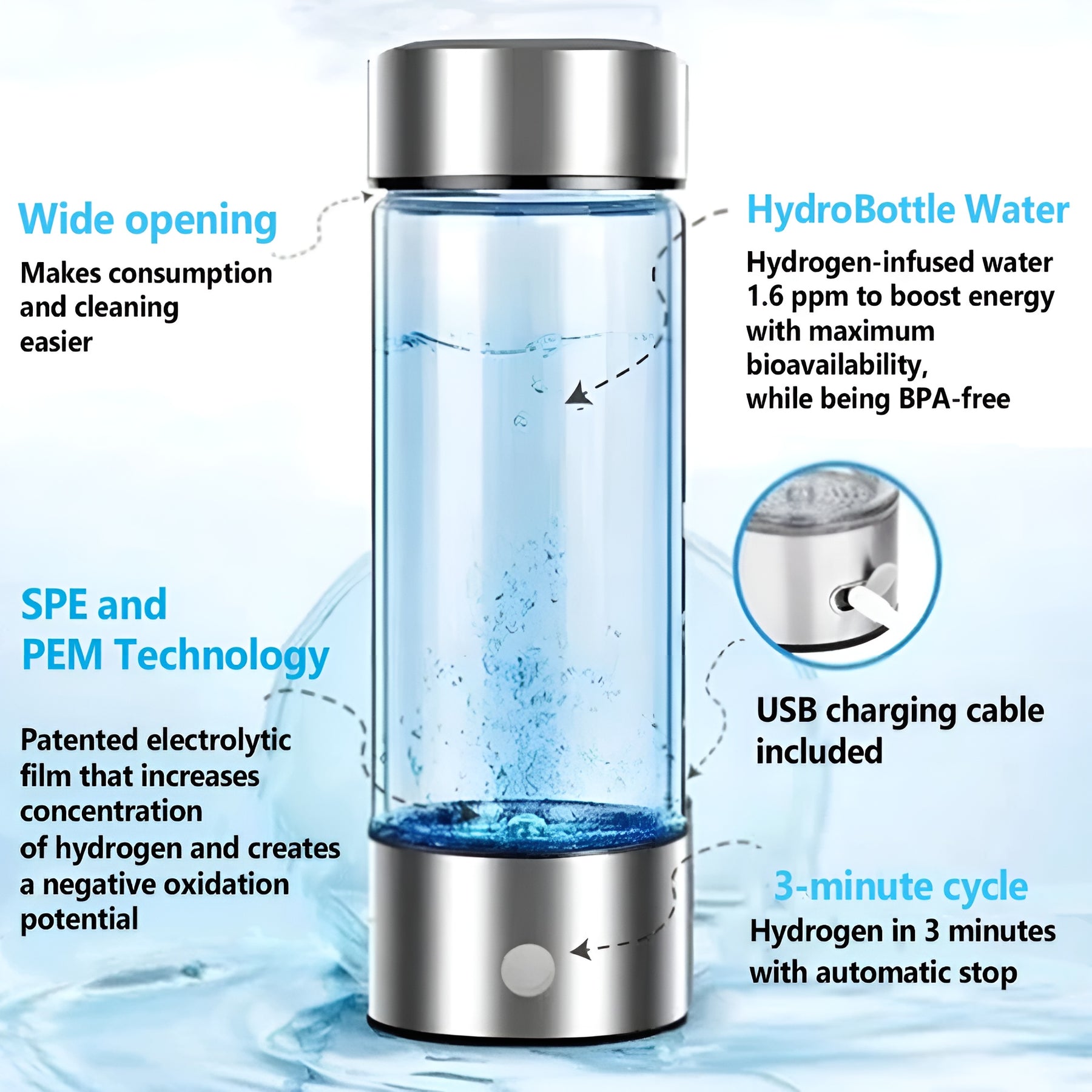 La nostra bottiglia utilizza un semplice processo chiamato elettrolisi per dividere l'acqua in idrogeno e ossigeno. Questo processo arricchisce l'acqua con idrogeno, trasformandola in un potente antiossidante. Bere regolarmente acqua ricca di idrogeno può aiutare il corpo a combattere lo stress ossidativo e migliorare la salute e il benessere generale.